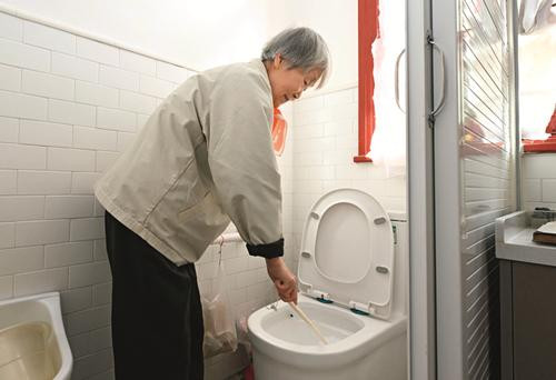 2025年10月29日,上海市杨浦区居民田依平在家清理抽水马桶。(图/新华社记者陈浩明)